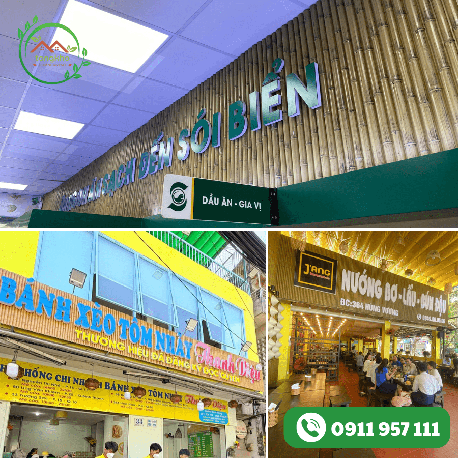 Tấm tre ốp bảng hiệu mang lại vẻ đẹp mộc mạc, gần gũi thiên nhiên, giúp bảng hiệu hàng quán trở nên nổi bật và thu hút ánh nhìn.