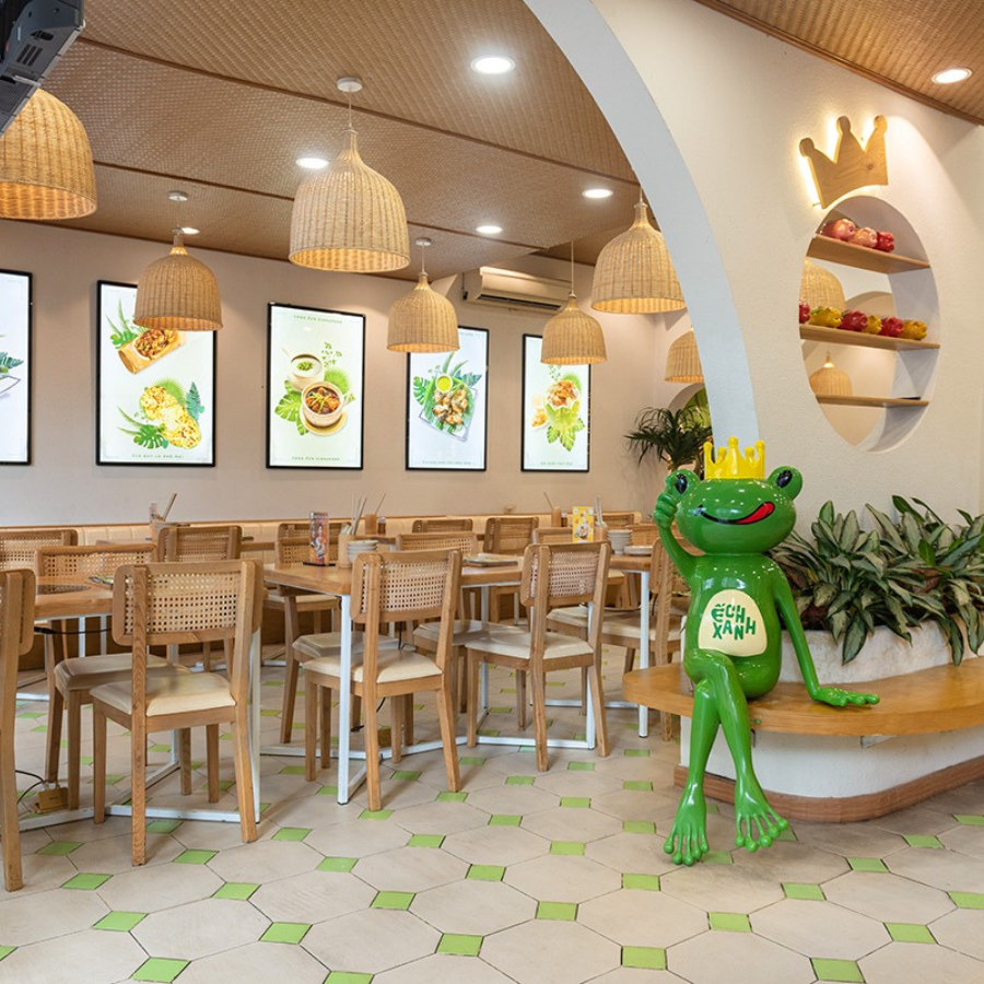 Nội thất nhà hàng Ếch Xanh sử dụng trần cót ép nhân tạo và mô hình linh vật ếch xanh dễ thương.
