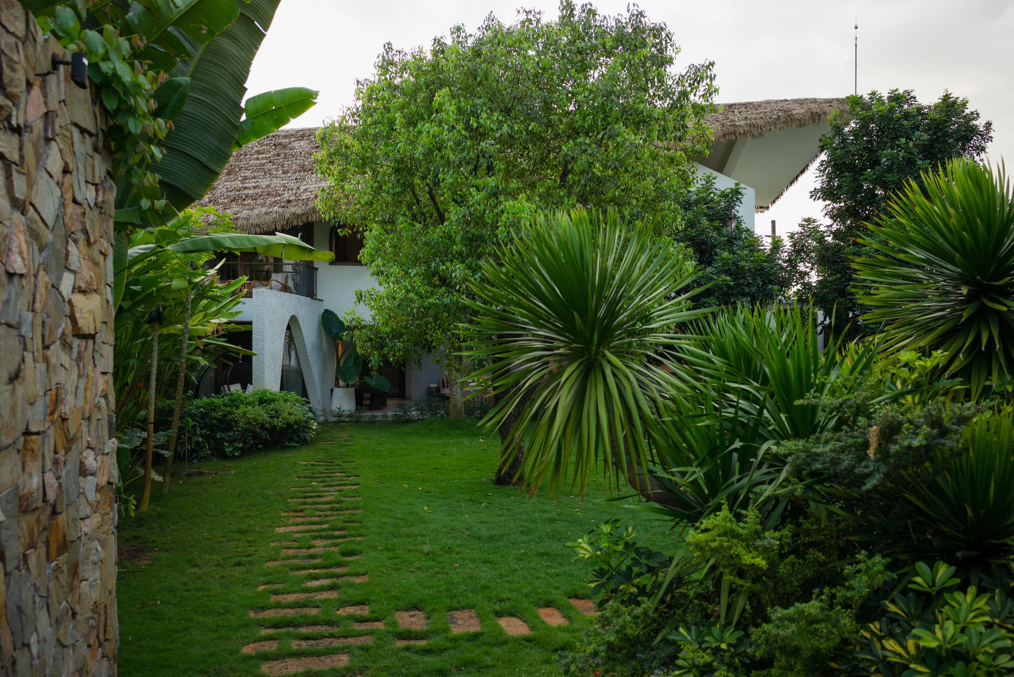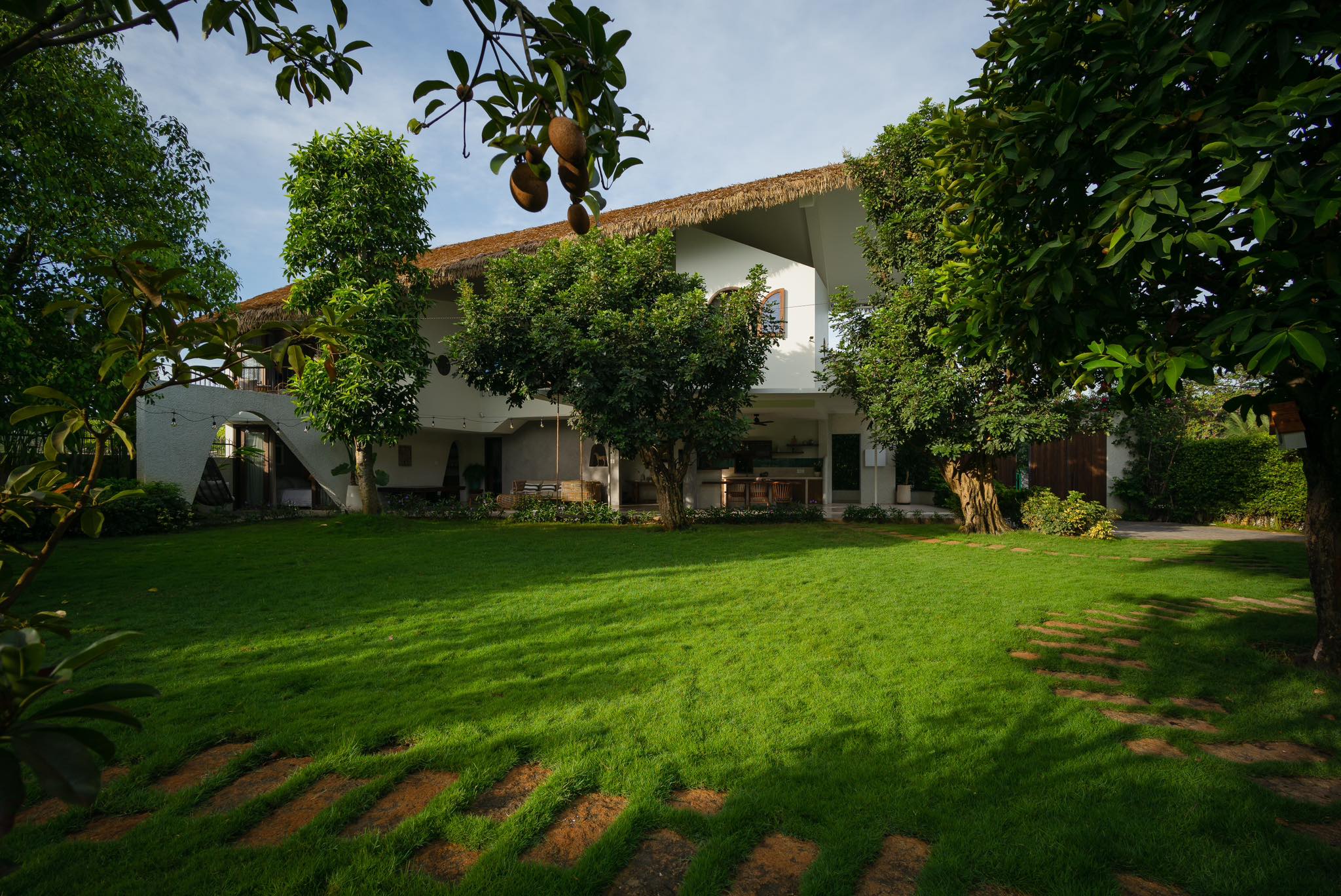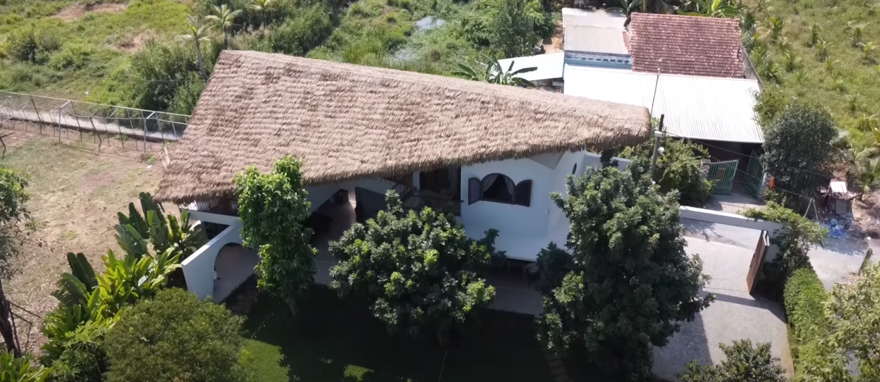 Biệt thự có diện tích 1500m², chia làm các khối nhà kết nối mềm mại qua hành lang mái rơm. Mái được tạo dáng cong nhẹ, đổ dốc tự nhiên để thoát nước, kết hợp cùng vật liệu rơm nhân tạo màu vàng xám, giúp công trình nổi bật nhưng vẫn hòa hợp với cảnh quan xung quanh.
