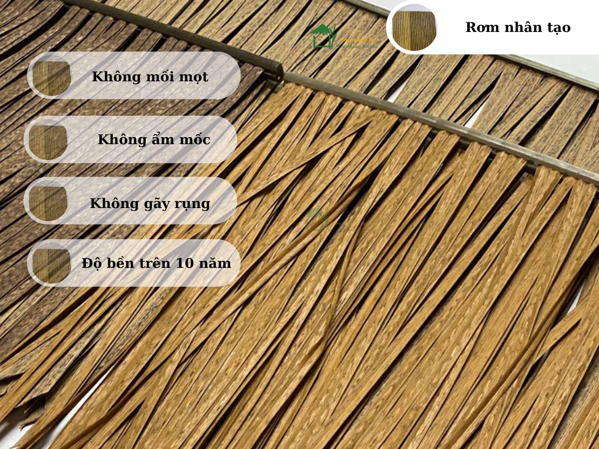 Một ưu điểm đáng chú ý khác là tính an toàn trong phòng cháy. Các mẫu rơm nhân tạo hiện nay có thể bổ sung lớp chống cháy lan – điều mà rơm thật hoàn toàn không thể làm được. Đây là yếu tố rất quan trọng trong những công trình nhà ở, nghỉ dưỡng hoặc quán cà phê sân vườn, nơi có đông người sử dụng.