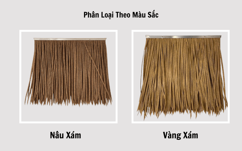 Rơm nhân tạo hiện có hai màu sắc chính: vàng xám và nâu xám, mỗi màu đều mô phỏng chân thật rơm thật theo thời gian. Màu vàng xám tượng trưng cho rơm mới cắt từ 1–2 năm – tươi sáng, sống động, phù hợp với không gian trẻ trung. Trong khi đó, màu nâu xám mang phong cách trầm ấm, cổ kính, thể hiện rơm đã qua 3–5 năm – thường được lựa chọn cho các công trình mang tính hoài cổ, mộc mạc.