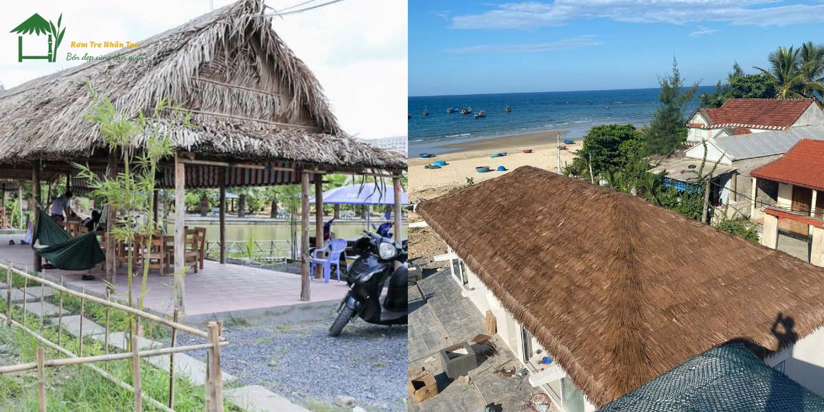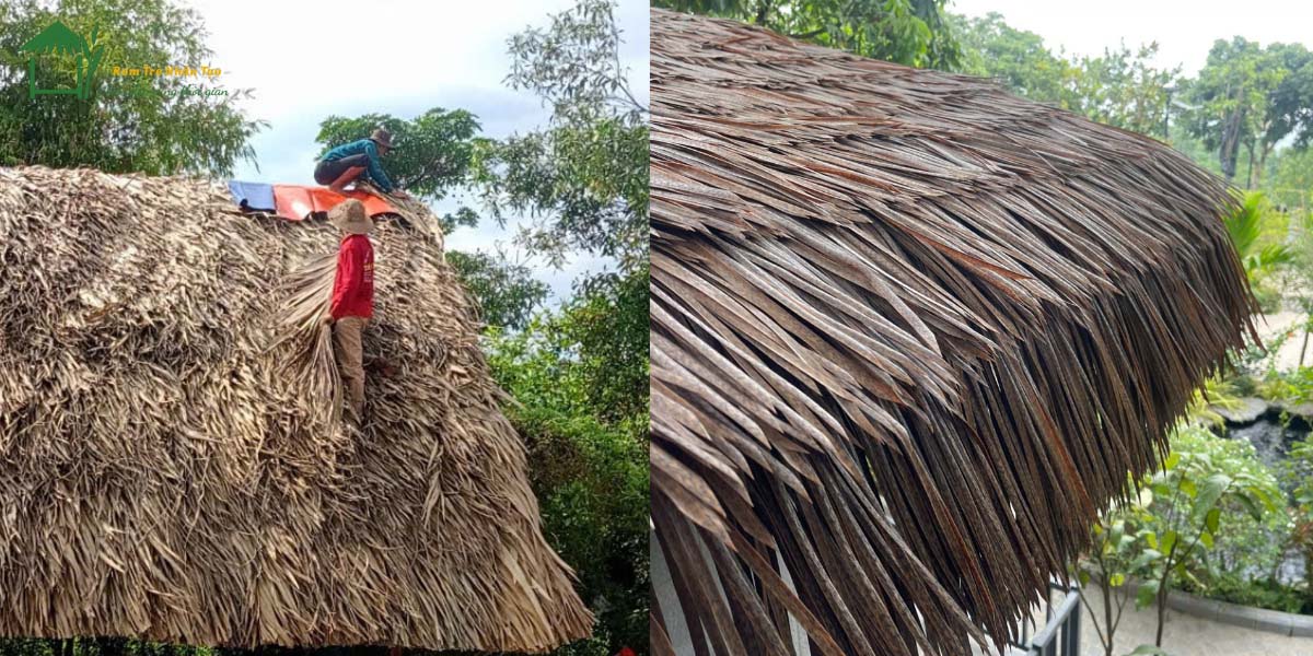 Lá dừa khô thi công thủ công, tốn thời gian, dễ bung sau thời gian ngắn, phải thay nguyên mảng lớn nếu hư hỏng.