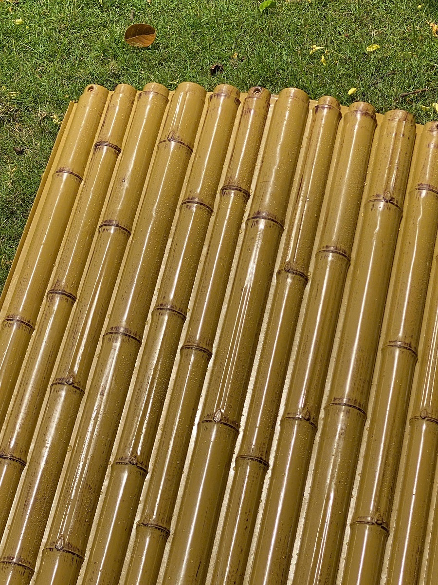 Cận cảnh ống tre nhân tạo được thiết kế mô phỏng y hệt tre thật với các đốt, mắt tre rõ nét. Bề mặt phủ lớp chống UV giúp giữ màu bền theo thời gian, không bạc màu khi sử dụng ngoài trời
