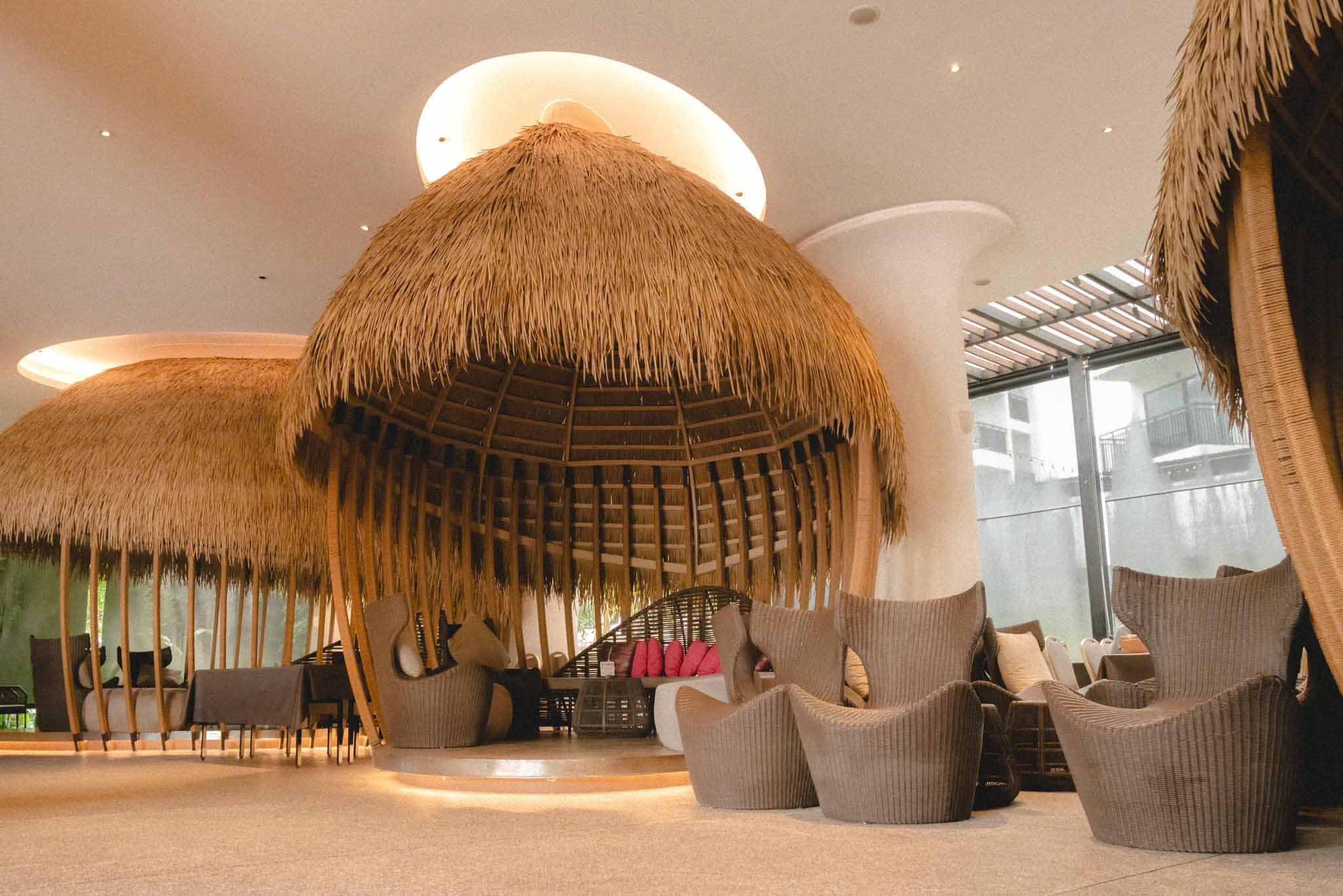Thi công rơm nhân tạo trực tiếp trên khung giúp khung phía trong được che khuất hoàn toàn, chỉ còn lại vẻ ngoài “đậm chất đồng quê” hoặc “rustic” đúng ý tưởng décor.Hình 6: Thiết kế lạ mắt trong nhà hàng khách sạn 5 sao, rơm nhân tạo tạo hình như mái lều thả trần. Xem thêm video hướng dẫn tại: https://www.youtube.com/@Dung-R%C6%A1mTreNh%C3%A2nt%E1%BA%A1o/shorts