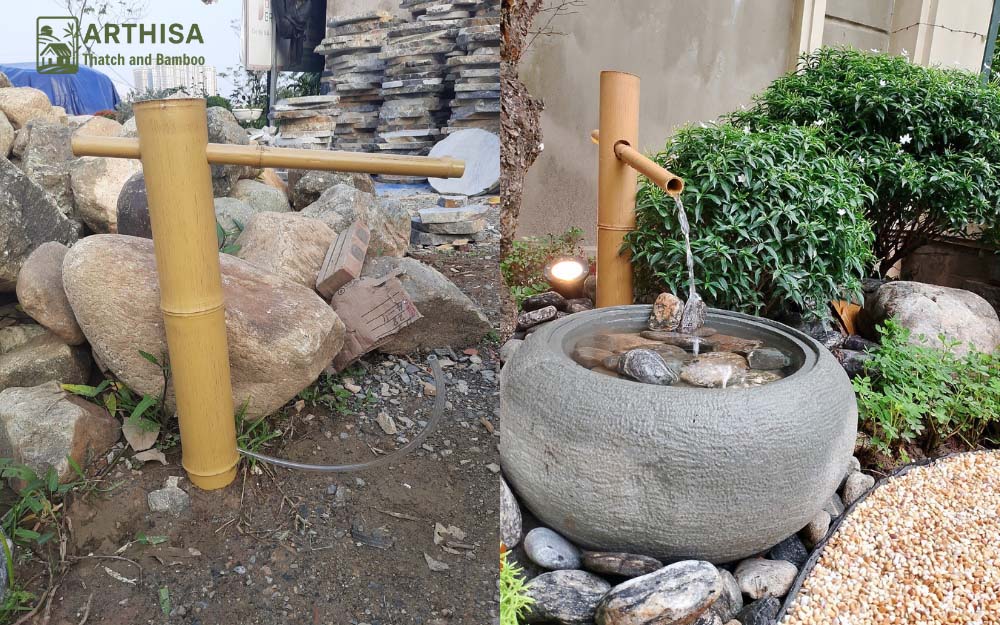Ống tre được sử dụng để làm các tiểu cảnh như ống nước, guồng nước trang trí, cối xay gió,… tạo điểm nhấn cho khu vườn.