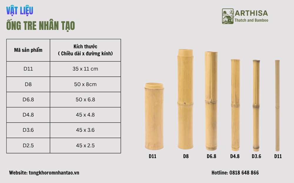 Ống tre nhân tạo được sản xuất theo hình dáng và màu sắc giống ống tre tự nhiên. Được làm từ nhựa tổng hợp, thường là nhựa nguyên sinh PE hoặc ABS, kết hợp với các phụ gia chống UV, chống oxy hóa, và chống oxy hóa. Dưới đây là một số thông số kỹ thuật của ống tre nhân tạo: